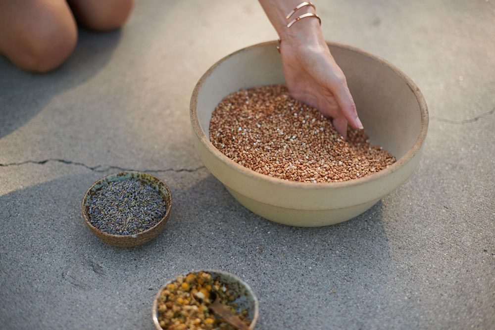 Ideal for beauty, meditation, or sleep rituals. Crafted from soft washed linen with a custom blend of lavender, chamomile, and organic oat groats. Includes a removable cotton inner pillow for easy washing.