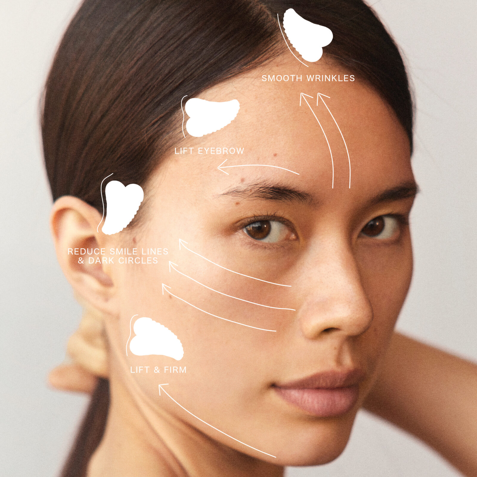 Glide the tool across your face in upwards and outwards directions using gentle to medium pressure, repeating each movement 5-6 times. Use the curved edge to sculpt areas such as cheekbones and jawline, the smooth-edged side for regions such as the T-zone, and the comb-edged side on areas where you want to pay extra attention towards tightening, toning, and smoothing.
