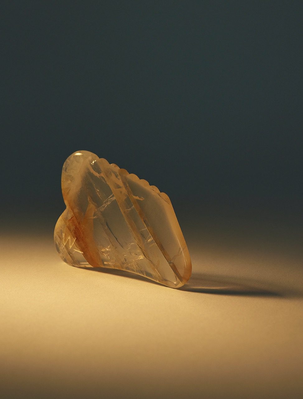 Made of naturally cooling Citrine crystal, which is linked to light and happiness and known for helping the mind and body feeling recharged and energized, this gua sha visibly helps to tighten and sculpt the tissue, release and relieve muscular tensions and puffiness while boosting blood circulation and stimulating lymphatic drainage to flush out toxins.